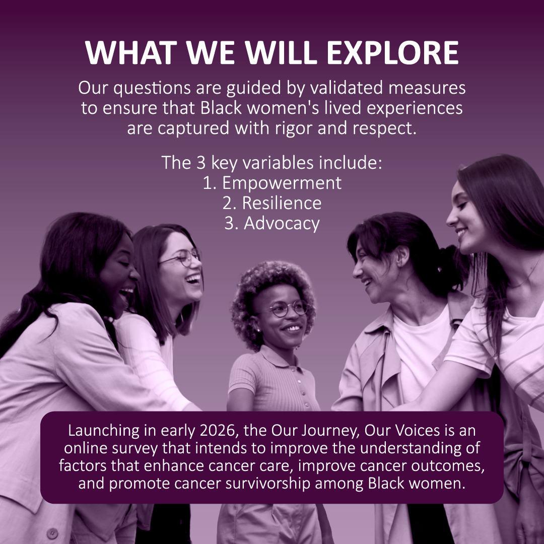 Launching in early 2026 this online survey will improve understanding of the factors that promote cancer survivorship among Black women to improve cancer care and cancer outcomes